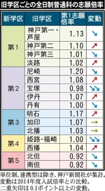 一方、姫路地域などへの受験生流出もささやかれた旧西播学区は、ふたを開けてみると平均倍率が前年度比0・05ポイントアップ。ある高校の管理職は「不安は大きかったが、積極的なPRで旧学区外から志願者を取り込めた」と安堵(あんど)しつつ、「学区が広がった分、一気に志願者が減ることもある。来年も気が抜けない」と話した。