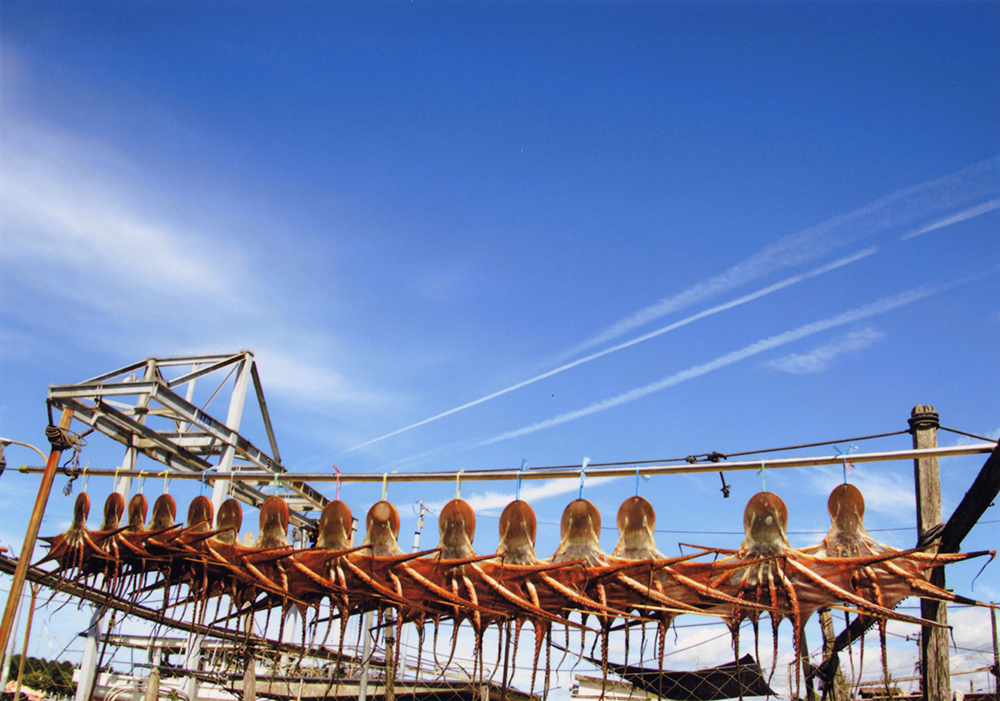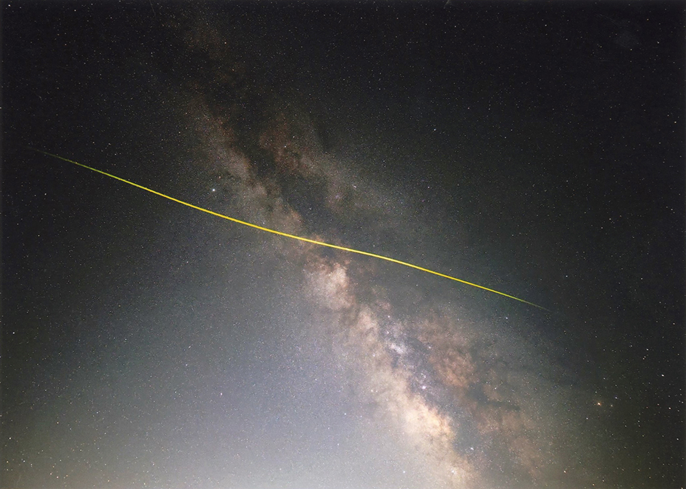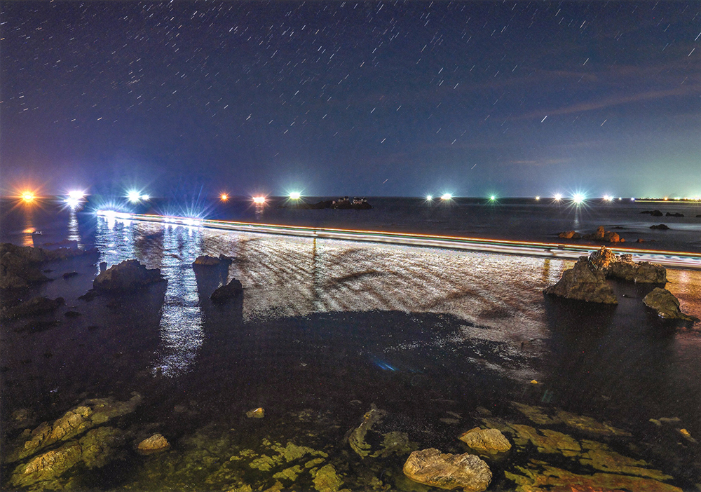 満天の星空に負けじと、まばゆく操業するいくつもの漁船。涼感ある但馬の夏の風景です。(ソニーα7Ⅲ 24~105ミリ 絞りf6・3 30秒×4)