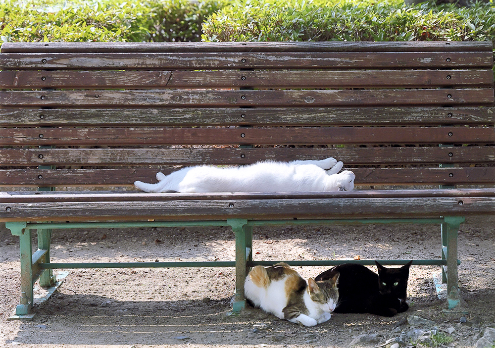 白、黒、三毛の三者三様がかわいらしい。白はまぶしさや暑さより、眠気が勝っているんでしょうか。(キヤノンEOSR6マークⅡ 24~105ミリ 絞りf5.6 3200分の1秒)