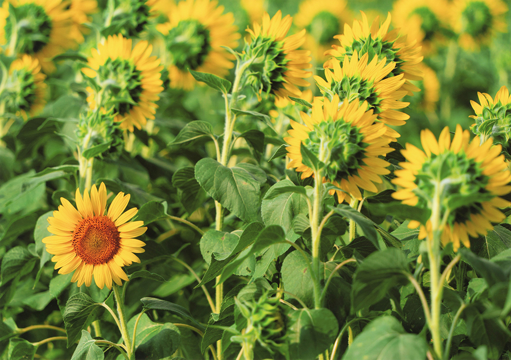 奥で咲く花より小さなヒマワリ。三分割法を少し意識すると、左下の花に視線が向きやすいでしょう。(ソニーα9 28~200ミリ 絞りf5・6 250分の1秒)