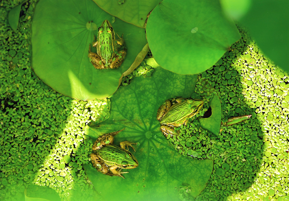 ハスの花でなく、葉の陰で休むカエルたちにレンズを向けました。清涼感ある色合いです。(ニコンZ5 24~120ミリ 絞りf4 200分の1秒)