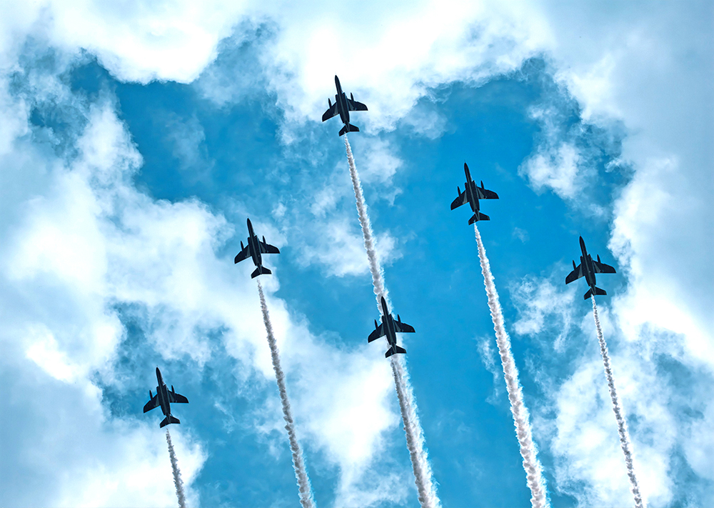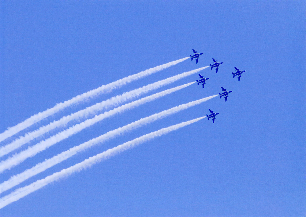 兵庫県からもブルーインパルスの展示飛行を見ることができました。機体の青が映えています。(キヤノンEOS5D 100~400ミリ 絞りf22 3200分の1秒)