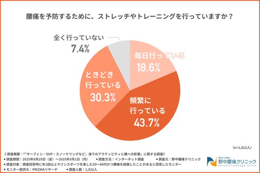 そこで今回、野中腰痛クリニック(https://nonaka-lc.com/)は、年1回以上マリンスポーツを楽しむ20~60代かつ腰痛を経験したことがある方を対象に、「『サーフィン・SUP・スノーケリングなど』海でのアクティビティと腰への影響」に関する調査を実施しました。