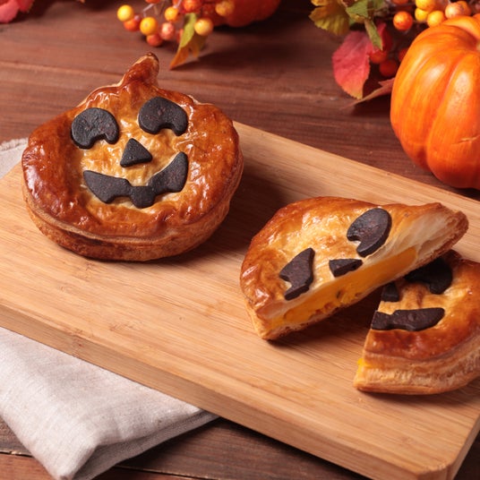 サクッと香ばしいかぼちゃ型のパイにかぼちゃクリームを包み、ジャック・オ・ランタンの顔を描きました。