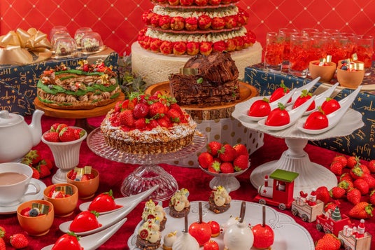 いちごたっぷりのタルト、いちごののムース、いちごのプリンアラモードに、雪だるまのスノードーム、クリスマスリース仕様のパリブレスト、ブッシュドノエルと、クリスマス気分を目でもお楽しみいただけるスイーツが並びます。お客様ご自身でクッキーにペインティングするアトラクションも登場!お食事は、いちごやチョコレートがアクセントになった洋食をお楽しみ頂けます。