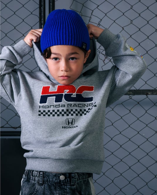 HRCのトリコロールのロゴを大胆なサガラ刺繍で表現したフーディ。