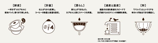 今回あえてコーヒーを選ばずに、ランダムに提供することにした背景には、カプセル式コーヒーのバリエーションが豊富である点や、偶発的なコーヒーとの出会いから味わいをより楽しんでもらいたいという思いがあるからです。ドリップポッドはプロのハンドドリップ技術を再現し、いつでも、どんなときも、ボタンひとつで“最高の一杯”が楽しめる方法として、カプセル式を提案してきました。このドリップポッドのカプセル式ドリップコーヒーシステムは、マシンとカプセル両方が揃うことで、初めて以下にあげる “プロのハンドドリップの技術”を再現する5つのポイントを実現することができます。