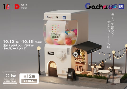 UCC上島珈琲株式会社(本社/兵庫県神戸市、資本金/10億円、社長/芝谷博司、以下UCC)の展開する“農園からこだわった、まっすぐな一杯”をお届けするカプセル式ドリップコーヒーシステム「ドリップポッド」は、10月10日の「UCCカプセルコーヒーの日※1」に合わせて、どなたでも気軽にカプセル式コーヒーを体験し、新たなコーヒーの味わいに出会うことができるイベント「UCCカプセル珈琲店」を10月10日(金)から10月13日(月・祝)の4日間限定でオープンします。今回は「ドリップポッド」10周年企画の第5弾として、今年日本上陸60周年を迎えたカプセルトイブランド『ガチャ(R)』を展開する株式会社タカラトミーアーツ(代表取締役社長:近藤歳久/所在地:東京都葛飾区、以下タカラトミーアーツ)とコラボレーションします。
