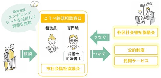 「こうべ終活相談窓口」は遺言や葬儀など終活に関する相談を無料で受け付け、弁護士や司法書士による専門相談も提供する取り組みです。