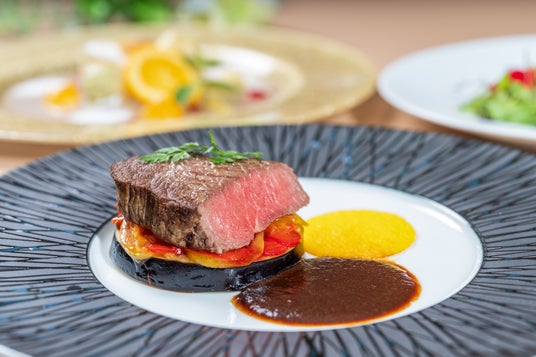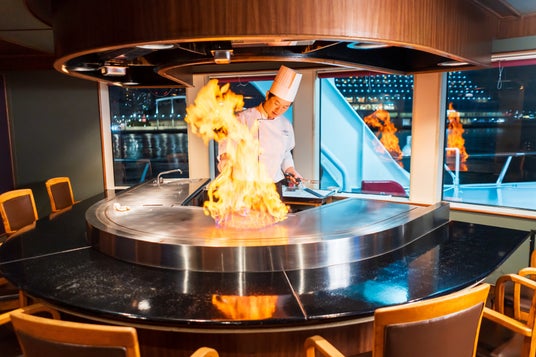 花火クルーズのお食事は「フレンチのフルコース」または「鉄板焼きのフルコース」から選択可能。