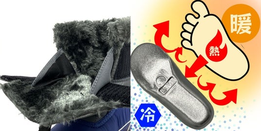 アルミインソール:裏地にアルミ素材を張り合わせた、防寒ブーツ専用のインソール。保温機能により冷えを軽減します。