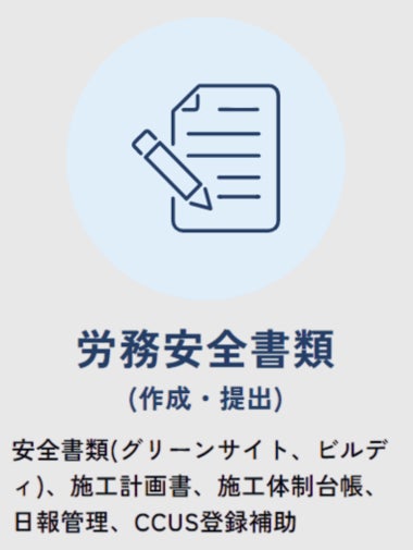 グリーンサイト・CCUS対応や労働安全衛生関連書類の作成・提出に加え、官公庁への申請や受注契約まで一括で代行。現場や経営者の負担を大幅に軽減します。
