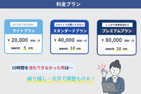 専任スタッフを採用するより低コストで、必要な業務だけを柔軟にアウトソース可能。小規模企業でも導入しやすい料金設定です。