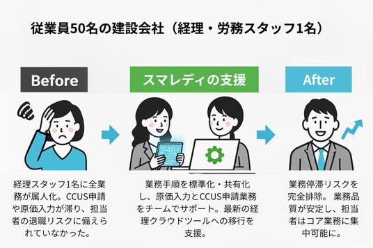 「スマレディ for 建設業」で建設業の人手不足・属人化を解消!グリーンサイト・CCUS対応から原価管理まで専門スタッフが業務代行します!