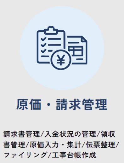 見積・請求・原価管理から支払・入金チェック、さらに人事・採用関連の労務業務まで幅広くサポート。事務作業の属人化を防ぎ、業務効率を改善します。