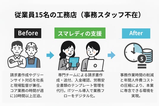 「スマレディ for 建設業」の導入は、単なる事務代行ではありません。人手不足・コスト課題を根本から解消し、施工現場と経営の両面にメリットをもたらすサービスです。