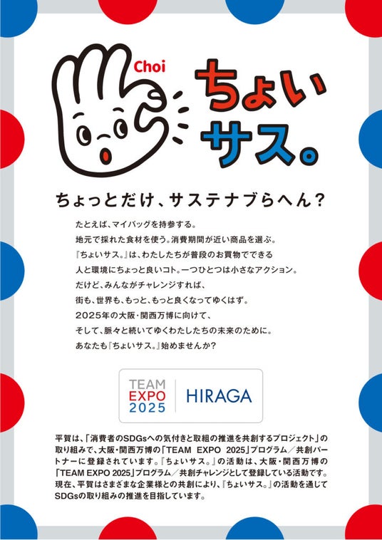 「小売の課題解決が日本一得意な会社」を目指す 株式会社平賀(本社:東京都練馬区、代表:中前圭司)は、大阪・関西万博「TEAM EXPO 2025」の取り組みテーマとして『ちょいサス。』を実施しています。この『ちょいサス。』を発展させて実施する食品ロス削減消費者キャンペーンが、環境省「令和7年度食品の消費行動に伴う食品ロス削減対策導入モデル事業」に採択されました。