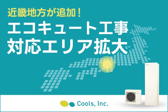省エネ設備の専門店Coolsが「エコキュート」の工事対応エリアをさらに拡充!近畿地方(滋賀、京都、大阪、兵庫、奈良、和歌山)の2府4県が新たに追加。全国各地(一部地域除く)で幅広くサービスを提供。