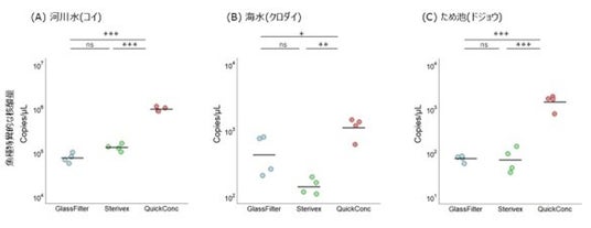 神戸大学との共同研究において、河川、海水、ため池から採水したサンプルを用いて、従来広く用いられてきた濃縮法(ガラス繊維フィルター法、Sterivexフィルター法)と性能を比較する実験を行いました。その結果、以下の点が明らかになりました。