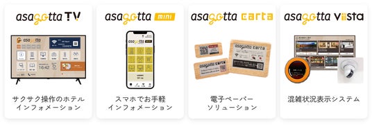 asagottaシリーズは、「VODをやめたい」というホテルからのご相談を受けて開発した、客室TVシステム"asagotta TV"と、同システムから派生したホテル向け総合ITソリューションです。フロント問い合わせの削減、業務効率化、ペーパーレス、インバウンド対応など、ホテルには業務効率化とコスト削減を、ゲストには快適な宿泊体験を提供します。