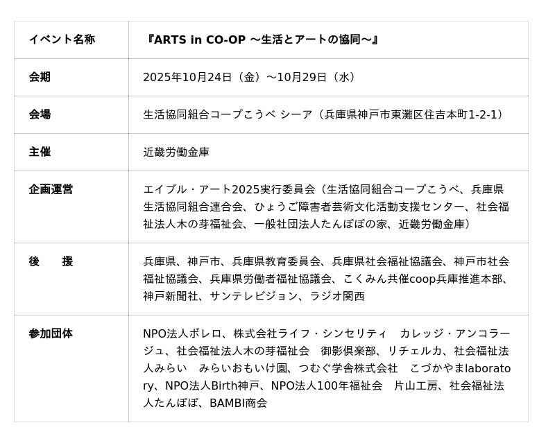 生活協同組合コープこうべは、近畿労働金庫、一般社団法人たんぽぽの家などとの協働で、『ARTS in CO-OP ~生活とアートの協同~』 を開催します。障がいのある人の表現活動を“日常の買い物空間”で紹介し、アートを通じて地域・くらし・多様性をつなぐ試みです。
