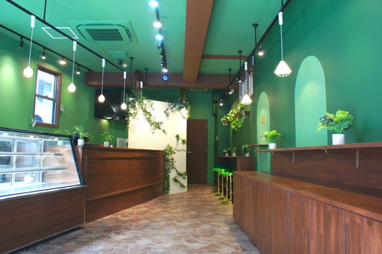木の温もりとグリーンを基調にした内装は、まるで小さな温室のような心地よさ。カウンター5席のイートインスペースでは、オリジナルブレンドコーヒーや地元ドリンク・アルコール飲料とともに、ゆったりとスイーツを楽しめます。