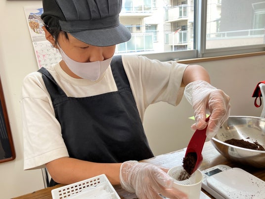 自家焙煎コーヒー「RISUSU COFFEE」でのドリップバッグ作成作業風景