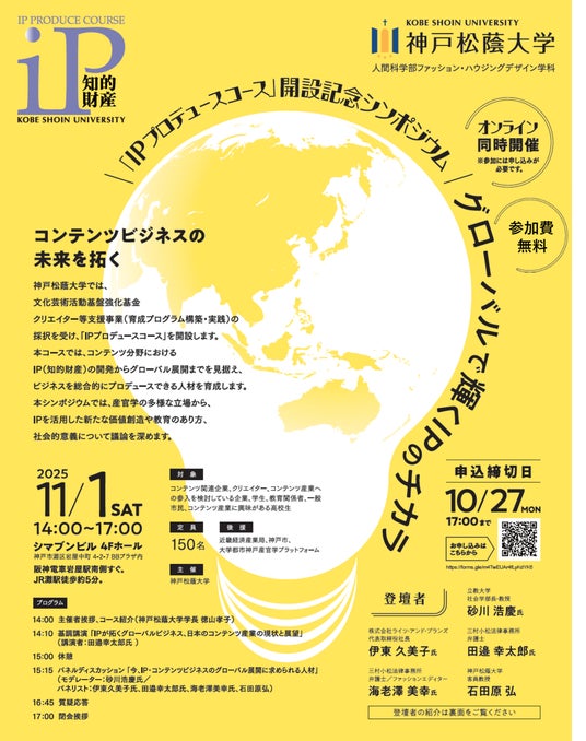 神戸松蔭大学人間科学部ファッション・ハウジングデザイン学科では、独立行政法人日本芸術文化振興会の助成事業「文化芸術活動基盤強化基金 クリエイター等支援事業」の採択を受けて、「IPプロデュースコース」を開設する運びとなりました。本コースにおきましては、コンテンツ分野におけるIP(知的財産)の開発・育成からグローバルな展開まで、ビジネス全体をプロデュースできる人材の育成をめざします。このたび、政府の進めるエンタメ・クリエイティブ産業戦略のアクションプランをふまえたうえで、産官学連携によるクリエイティブ教育の在り方とIPを活用した新たな価値創造について考察する記念シンポジウムを開催いたします。