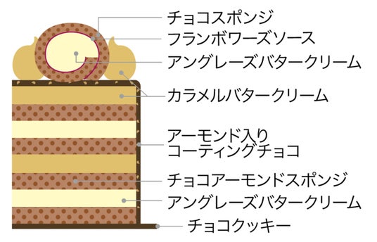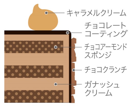 コクのあるガナッシュクリームとチョコアーモンドスポンジをチョコレートで包み、上には丁寧に炊いたキャラメルソース入りのクリームを絞りました。