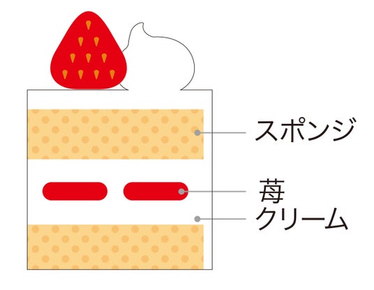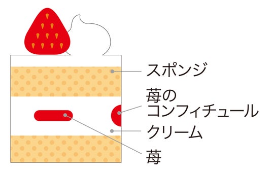 風味と食感の異なる2種類のスポンジを使用し、苺とフランボワーズのムース、北海道産生クリームをブレンドしたクリームと苺をサンドしました。
