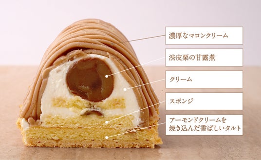 ヨーロッパ産の香り高い栗を使用した3種類のマロンペーストを絶妙にブレンド。風味も味わいも濃厚なモンブランクリームで、まるごとの渋皮栗とクリームを包み、香ばしいアーモンドの風味のタルトにのせて仕上げました。ほんのり香るラム酒が奥ゆきのある味わいを引き立てます。店頭で販売されている「モンブラン」と同じクリームを使用し、お取り寄せでも贅沢なひとときを楽しんでいただけるよう心を込めてお届けします。