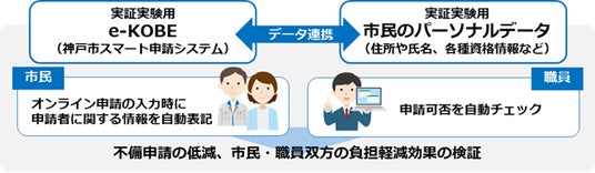 具体的には、実証実験用の「e-KOBE(神戸市スマート申請システム)」(当社が提供するTASKクラウドスマート申請システムで構築)と、市が保有する市民のパーソナルデータ(住所や氏名、各種資格情報など/実証実験では仮データを用意)を連携し、1.オンライン申請の入力時に申請者に関する情報を自動表記、2.申請可否の自動チェック――を行うことで不備申請の低減を図り、市民・職員双方の負担軽減効果を検証します。