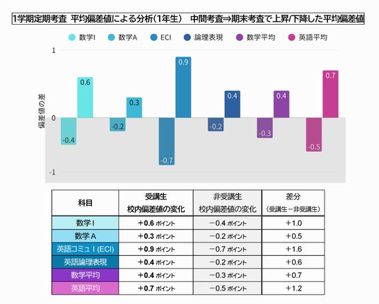 特に、数学Iや英語コミュニケーションIでは受講生がそれぞれ0.6ポイント、0.9ポイント上昇しており、非受講生との差は1.0~1.6ポイントと着実な成果が示されています。また、数学Aや英語論理表現でも受講生は安定して伸びを見せ、非受講生との差は0.5~0.6ポイントとなっています。