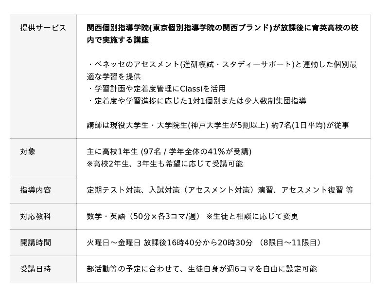 東京個別指導学院・ベネッセ・Classiは、ベネッセグループ連携によるメリットを生かして協働し、2023年度から中学・高校に向けて、「放課後学習支援プログラム」を提供しています。東京個別指導学院が運営の主体となり、各校それぞれの目的・目標に合わせたプログラムを設計。東京個別指導学院の教室において指導経験のある講師が、ベネッセのアセスメント(進研模試・スタディーサポート・学力推移調査等)や教育プラットフォームClassiを活用して、学力層別・個人別の指導と学習進捗管理を行います。■育英高校における「放課後特別講座」概要