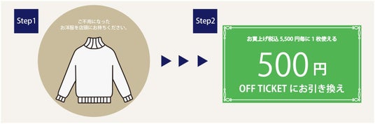 回収キャンペーン期間中は、ジャヴァコーポレーションのブランドだけでなく、他社の衣類品も含め、ご不要になったお洋服を店頭にお持ちいただくと、アイテム1点につき500円オフのチケット1枚と交換いたします。