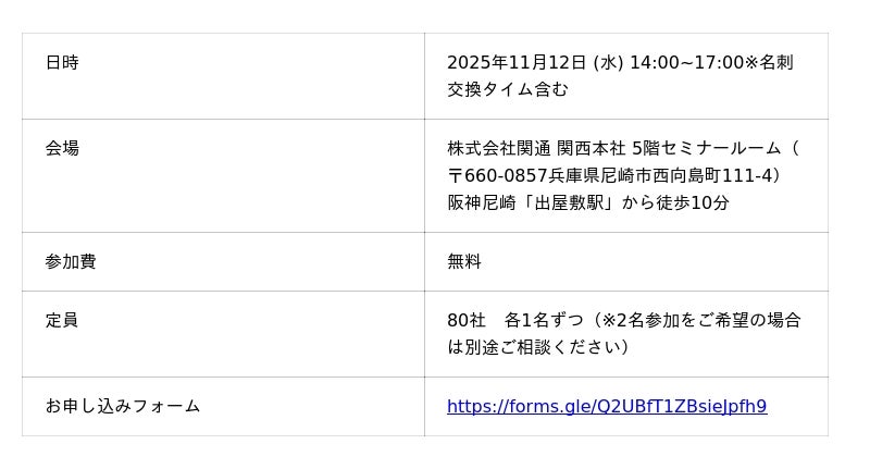 物流とITオートメーション事業を展開する、株式会社関通(本社:兵庫県尼崎市、代表取締役社長:達城 久裕、以下「関通」)は、世界73か国、5000現場超への物流・製造現場向けシステム導入の実績を持つ、株式会社アイオイ・システム(本社:東京都品川区、代表取締役社長:吉野豊、以下「アイオイ」)と共催で、「物流 × IT の共創による企業交流会」を2025年11月12日(水)に開催いたします。