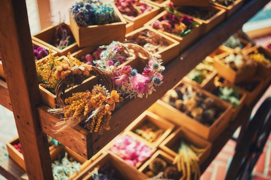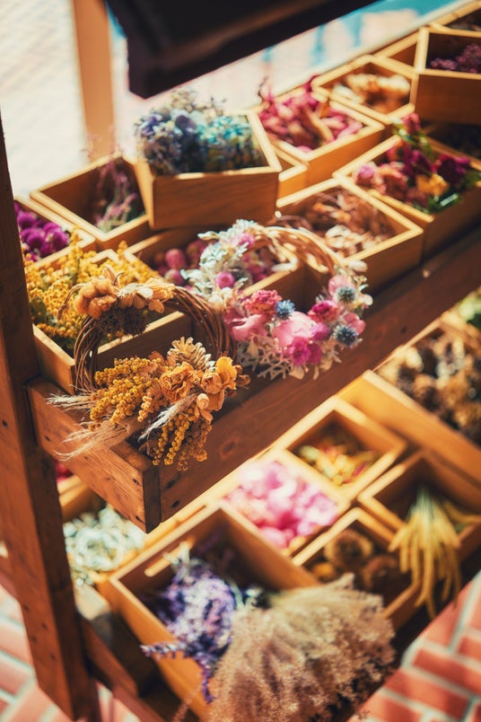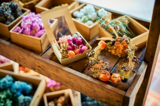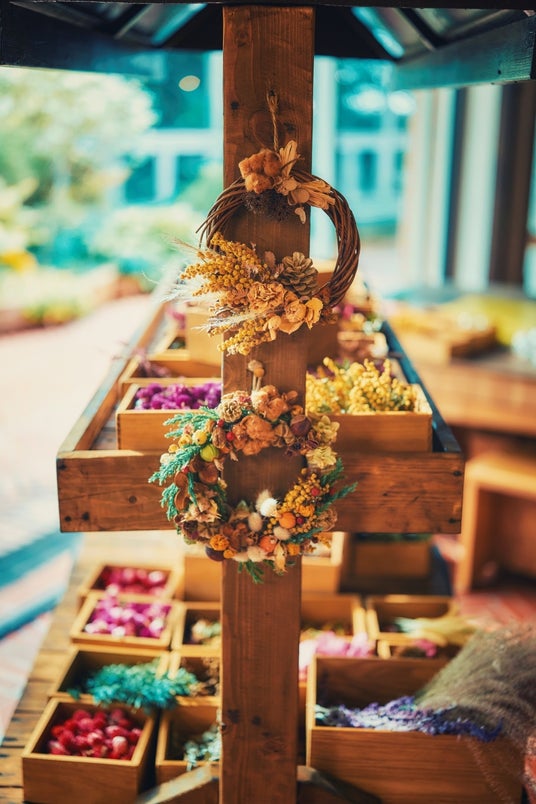 季節ごとに園内で育った花やハーブを収穫し、お客様にご提供させていただけるようドライフラワーにしています。ドライフラワーをお好きなだけ取って所定の箱に入れて、お持ち帰りいただきご自宅で自分だけのオリジナルのリースをおつくりいただけます