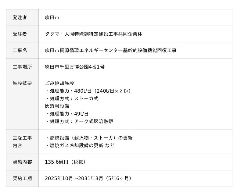 株式会社タクマ(本社:兵庫県尼崎市、社長:濱田州朗)を代表とする企業グループは、このほど、大阪府吹田市から、同市のごみ処理施設「吹田市資源循環エネルギーセンター」(以下「本施設」)の基幹的設備機能回復工事(以下「本工事」)を受注しましたので、お知らせいたします。