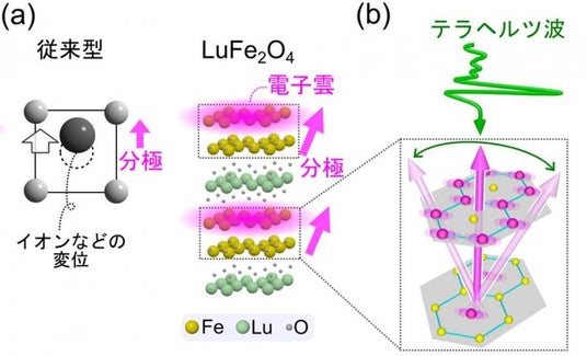 図. 結晶構造と本研究の実験の模式図。(a)従来型の強誘電体では重いイオンなどの変位によって分極が生じる。一方、電子強誘電体LuFe2O4では軽い電子雲の変形によって分極が生じる。結晶構造は、鉄(Fe)原子からなる層と、Luからなる希土類層が交互に積層している。(b)Fe層で生じる強誘電分極と、テラヘルツ波(図中の緑矢印)による分極駆動。分極は電子(図中の紫球)のチームプレーによって生じているため刺激に敏感で、高速に制御できる。