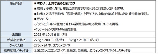 一般的に苦みを強くすると、後味の苦み・雑味も出てきやすい傾向にあるため、飲みごたえのある味わいや上質な苦みは残しつつ、後味の雑味を低減できるように試行錯誤しました。焙煎方法にこだわり抽出方法を工夫することで、後味の雑味を低減し「上質な苦みの余韻」を実現させています。また、多様な産地、複数の焙煎度で炒り分けすることで、「深いコク」を感じられるように設計しました。●製品概要『UCC BLACK無糖 黒の余韻 リキャップ缶275g』 と、『同375g』