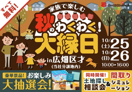 2025年10月25日(土)・26日(日)の2日間、兵庫県姫路市広畑区才(ひろはたくさい)にある赤鹿地所の分譲地「ロワイヤルガーデンズ広畑イーストコートI」にて、ご家族で楽しめる「秋のわくわく大縁日」を開催します。射的、スーパーボールすくい、わなげ、お菓子すくいなどの縁日イベントをはじめ、事前WEB予約者限定の大抽選会や、土地探し相談会、間取りシミュレーションなどを同時開催。地域の皆さまに、楽しく住まいを体験いただける2日間です(参加無料)。