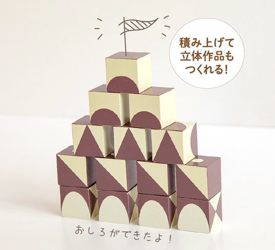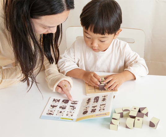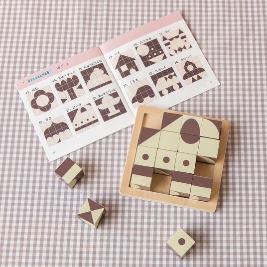 まるでチョコレートみたいな色合いの木のパズル。キューブに描かれた模様を組みあわせて絵柄を完成させる模様あわせのパズルです。幼児教室監修のレシピブック(テキストブック)が付いており、作例はたっぷり115問!お子様の年齢や発達に合わせられるよう6段階のレベルを設定しています。アイデア次第で模様の組み合わせは無限大!「これは何に見える?」「きれいな模様を作ってみよう」など、こどもの自由な創作意欲を掻き立てます。