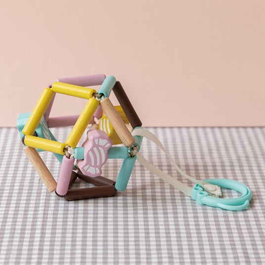 カラフルキャンディが付いたラトルボール。小さな手で掴みやすい直径1cmの木の棒がゴムで連結して様々な形状に変化します。木のおもちゃは熱くなりすぎたり冷たくなりすぎたりしないので、赤ちゃんの手にやさしくストレスが少ないおもちゃです。振るとカタカタと心地よい音を奏で、ラトルとしても楽しめます。