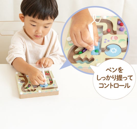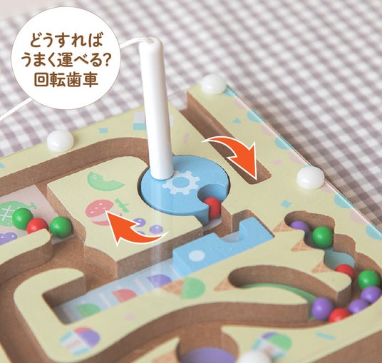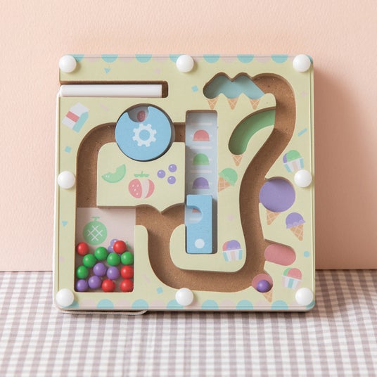 コンパクトな本体に、思わず夢中になるしかけがいっぱい!マグネットペンを使ってボールを動かす迷路あそびのおもちゃです。いちご・メロン・ぶどうの3色のボールをアイスに見立て、工場の中をぐるぐる運んでアイスクリームを完成させます。ぐるぐる回る歯車や、すいーっと動くベルトコンベアーを上手く動かしながら、集中力と思考力を育みます。