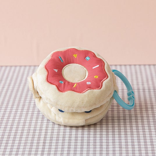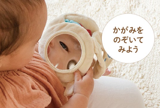 ふんわり美味しそうなドーナッツを開くと、大きなお口のパンダさんがこんにちは♪これはどんなお顔かな?両面ミラーを使ってパンダと自分の表情を見ながらまねっこあそびが出来ます。鏡で自分の顔を見ることで、顔のパーツを動かすことを学習し、表情のバリエーションが増えていきます。また、赤ちゃんの自己認識を促し、自分と他人とを区別することができるようになっていきます。