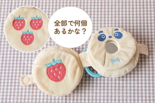 他にもいちごを数える数あそびや、カシャカシャ握って音を出す音あそびも楽しめ、飽きずに長く遊べます。汚れたら洗濯機のソフト洗いコースで丸洗いできるのも嬉しいポイントです。
