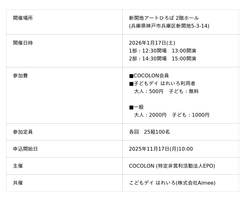 重症心身障がい児のと家族や支援者向けに学び・遊び・情報を提供をする「COCOLON」(運営:特定非営利活動法人EPO、東京都江戸川区、代表:齋藤えりか)は、「0歳からのファミリーコンサート」を1月17日(土)に新開地アートひろば(神戸市兵庫区)で開催します。このイベントは、障がいや医療的ケアを抱えるお子様も近くで生の音楽を楽しむことができ、きょうだい児や家族と一緒に参加して楽しむことができ、障がいがないお子様・ご家族も参加することができます。