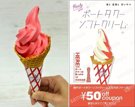 画像左:『神戸ポートタワー「ソフトクリーム」』の〈ストロベリー〉、右:クーポン券の紹介ポスター(画像はイメージです)
