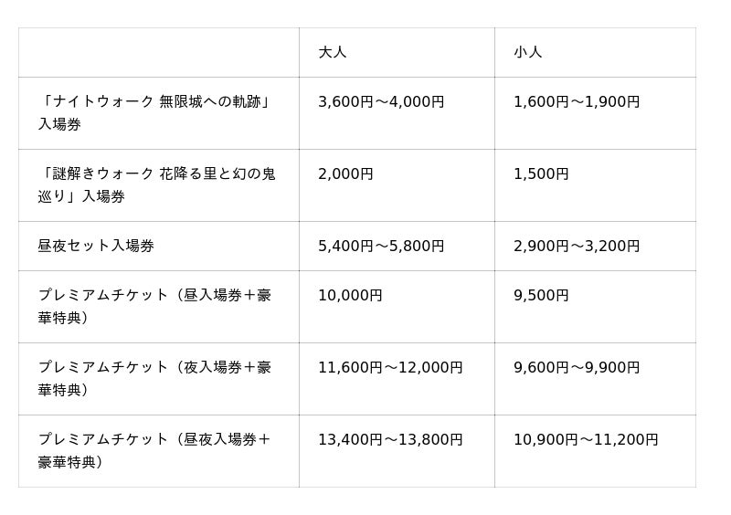 ※「ナイトウォーク 無限城への軌跡」については4歳以下無料。「謎解きウォーク 花降る里と幻の鬼巡り」に参加するには購入が必要となります