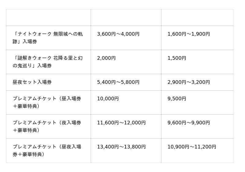 ※「ナイトウォーク 無限城への軌跡」については4歳以下無料。「謎解きウォーク 花降る里と幻の鬼巡り」に参加するには購入が必要となります